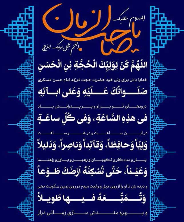 خدایا برای ولیت حجت بن الحسن که درود هایت بر او و پدرانش باد ، در این ساعت ، و در هر ساعت سرپرست و نگهبان و پیشوا و یاور و راهنما و دیده بان باش ، تا او را با رغبت در زمینت سکونت دهی ، و زمانی طولانی بهره مند سازی